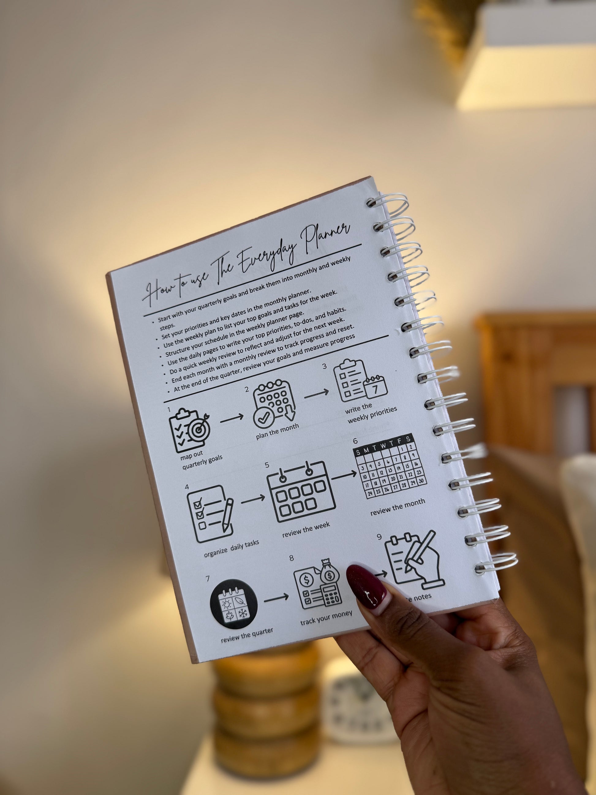 The Everyday Planner is designed for simple, intentional planning without overwhelm. It breaks your goals into quarters, helping you focus on what truly matters a quarter at a time. Take control over your months, weeks, and days with the thoughtfully outlined planning pages. Review your progress and stay on top of your goals minus the pressure!